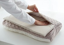 肌に優しい、吸湿性に優れた国産の「近江真綿」を使用。上部フィット層に真綿を使用し、下部クッション層に粒綿を使用した特殊2層構造のトップユニットを採用することで、しっとりとした心地よい感触を実現しました。